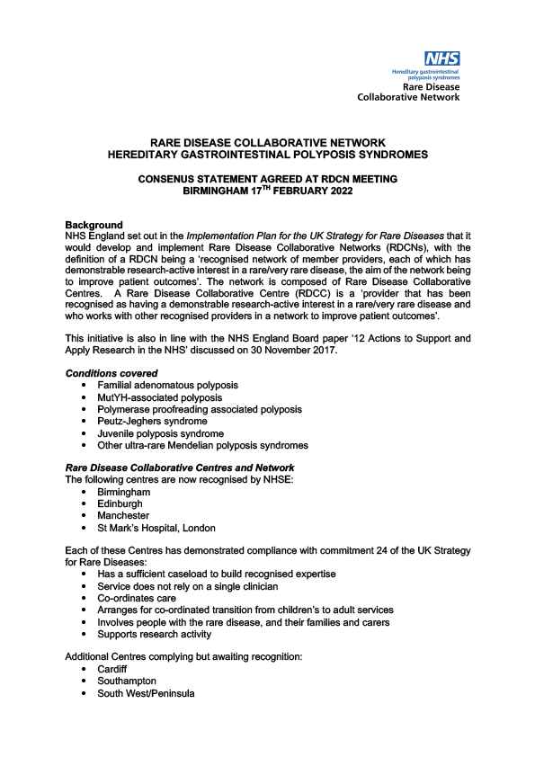 NHS England has set up a Rare Disease Collaborative Network (RDCN) to improve care for people with hereditary polyposis syndromes — including FAP, Peutz-Jeghers syndrome, Juvenile Polyposis syndrome, and other rare inherited conditions that cause polyps to form in the digestive system.
